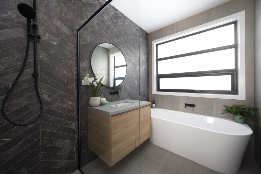 Modern main bathroom with shower, separate bathub and stylish vanity.