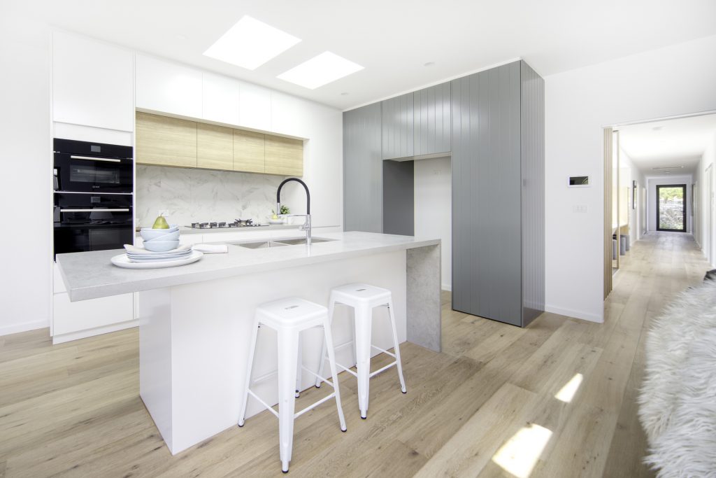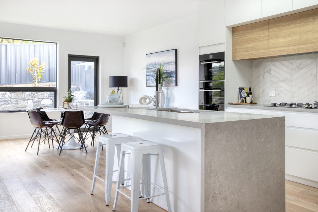 Designer kitchen with large island bench, attractive stone benchtops, fantastic storage space and appliances including, dishwasher and electric cooking.