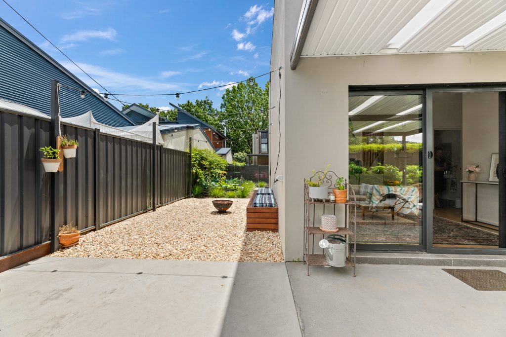 The home features a spacious open-plan living area and a large, designer kitchen with a breakfast bar, all seamlessly flowing into a private, landscaped wraparound courtyard. The outdoor space includes a covered entertaining area, a grassed lawn, and a well maintained vegetable patch, ideal for relaxation and gatherings.