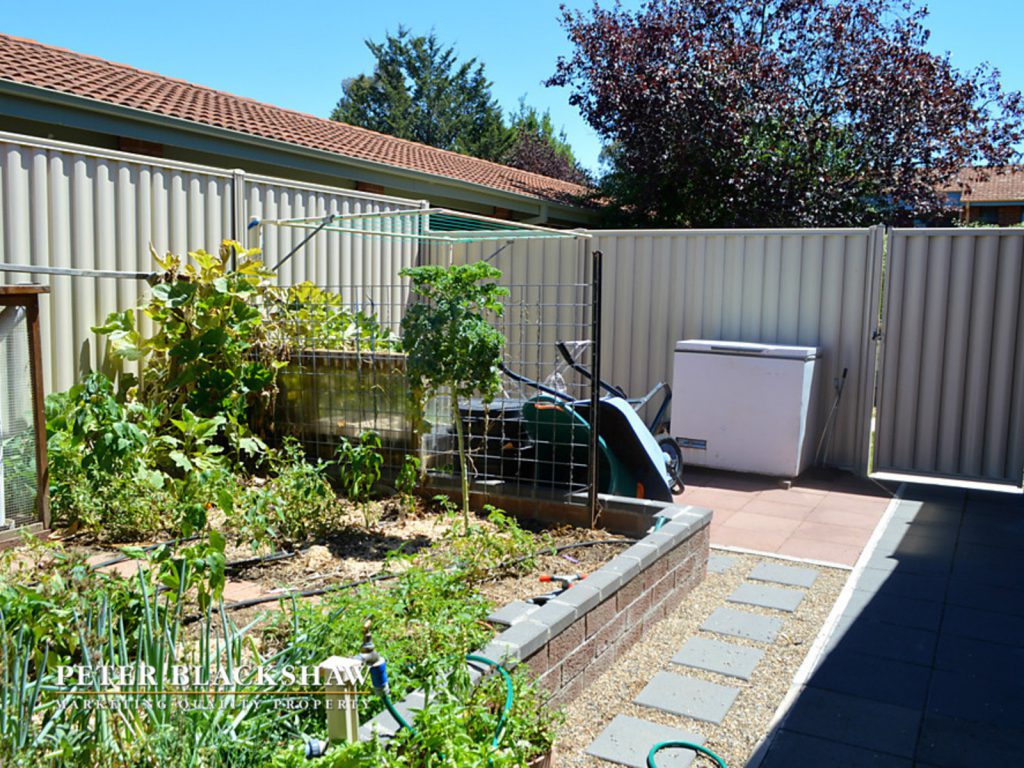 Fully enclosed rear yard with grassed area for children to play, separate area with established vegetable garden and two storage sheds.