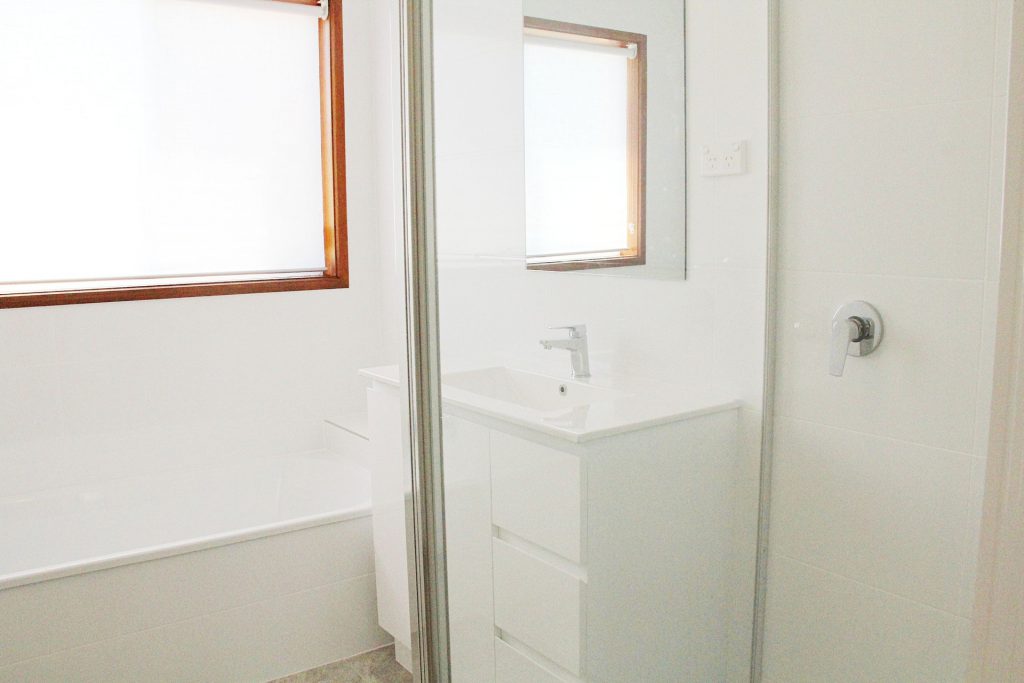 Renovated bathroom with modern vanity, bath-tub and separate shower.