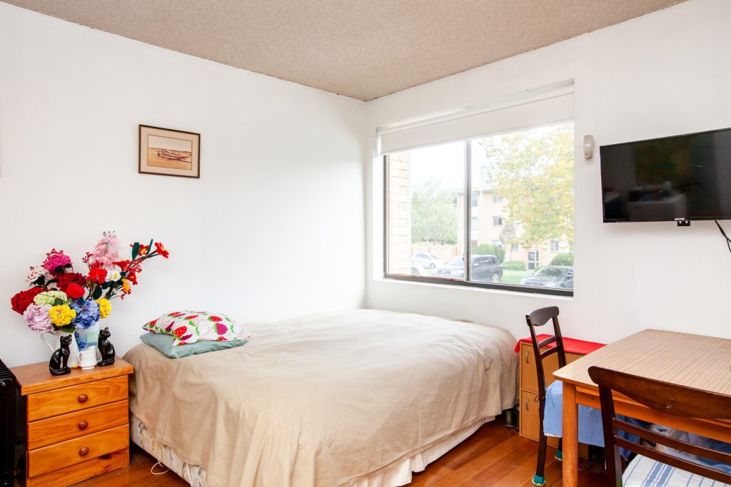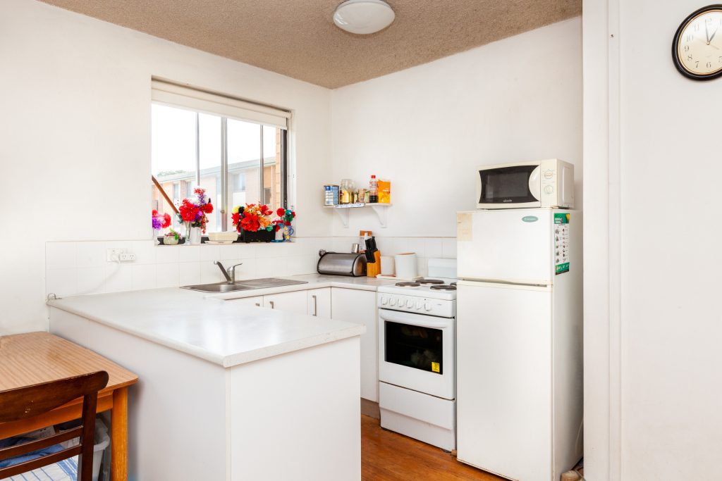 The apartment features good natural light and hardwood floors throughout the open plan living area which includes the combined bedroom and living area adjacent to the recently renovated kitchen. The hallway with storage cupboards leads to the separate bedroom, the common laundry is just outside the front door off the entry.