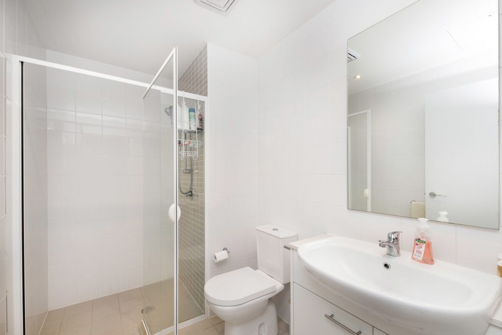 – Modern bathroom with floor to ceiling tiles
