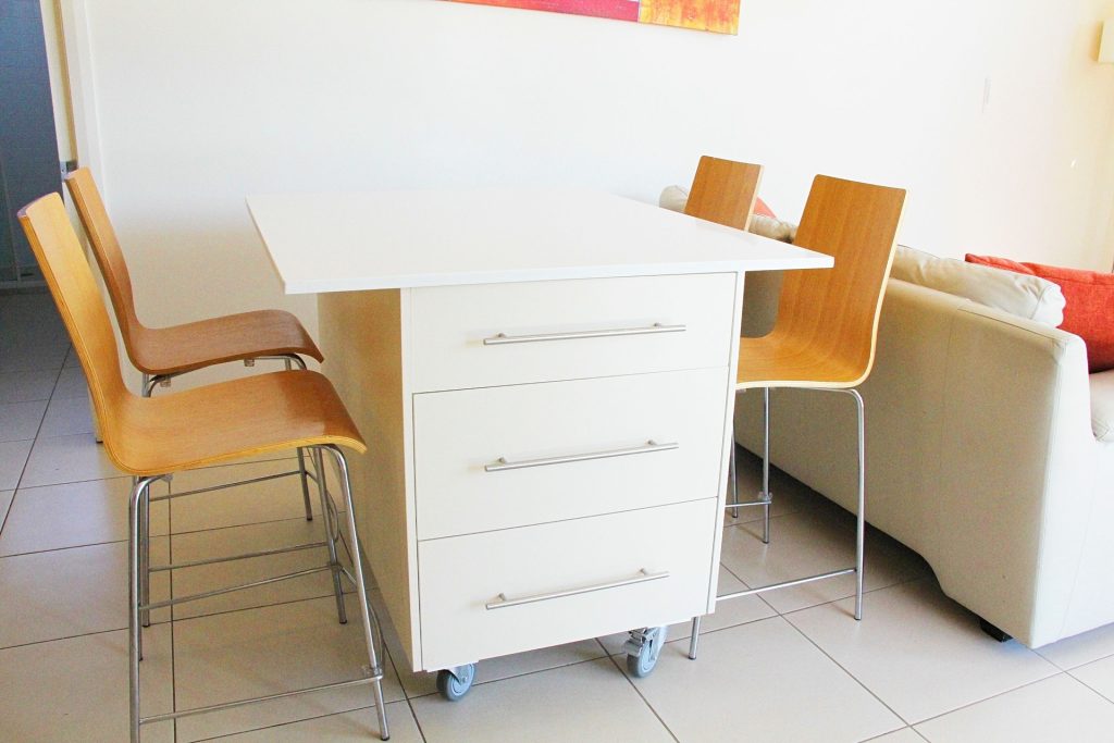 – Modern kitchen with stone benchtops, island bench and bespoke joinery.