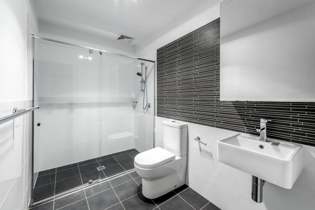 – Modern main bathroom with feature tiles & large shower recess.