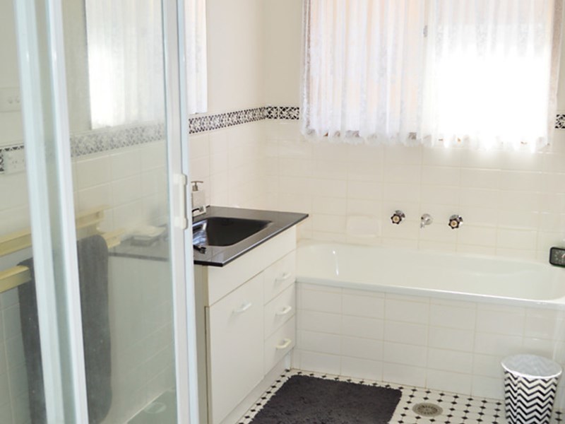 Convenient two way bathroom with bath tub plus separate shower recess.