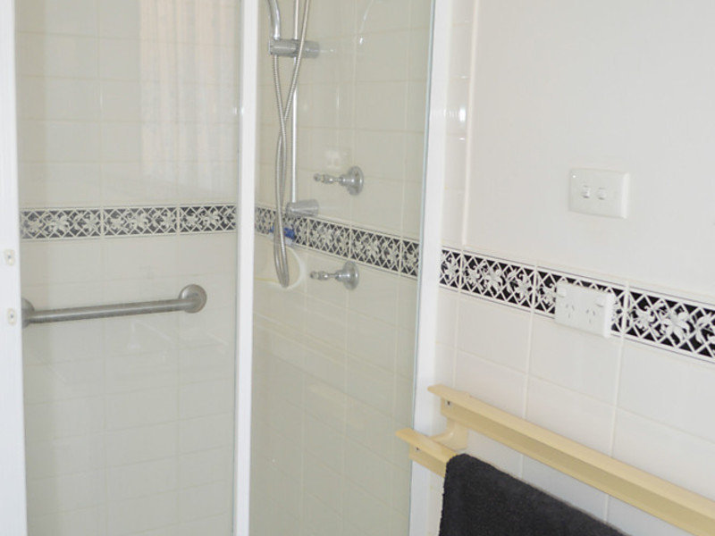 Convenient two way bathroom with bath tub plus separate shower recess.