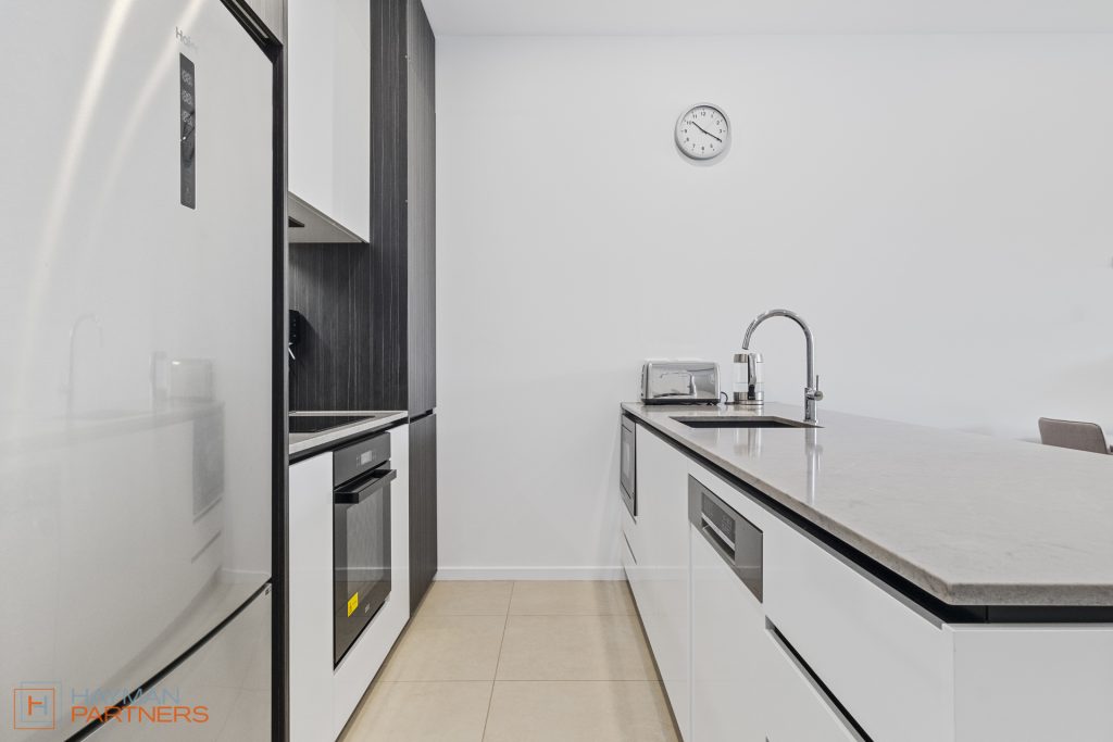 The modern kitchen features an induction cooktop, a Bosch dishwasher, and luxurious stone bench tops, making meal preparation a pleasure. These high-end amenities ensure both comfort and convenience in your daily living.