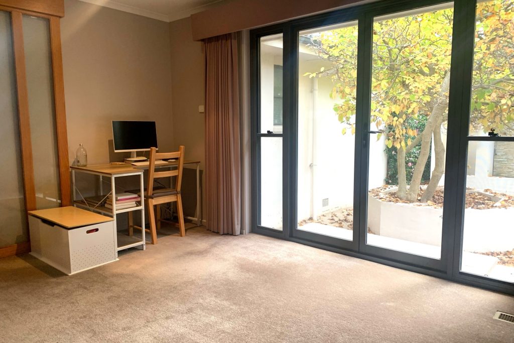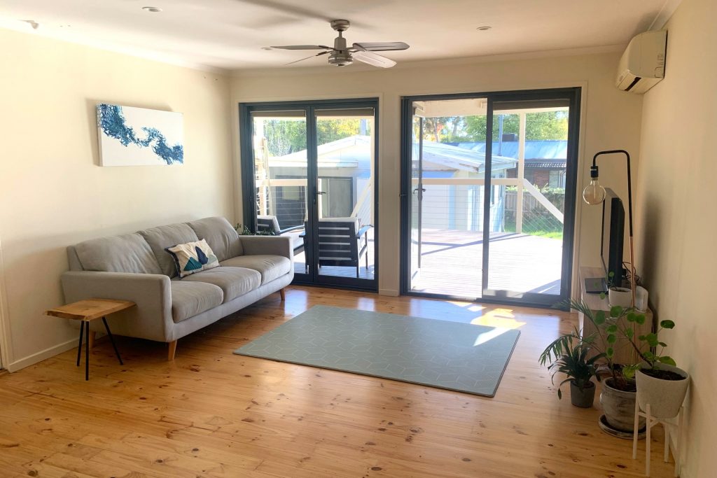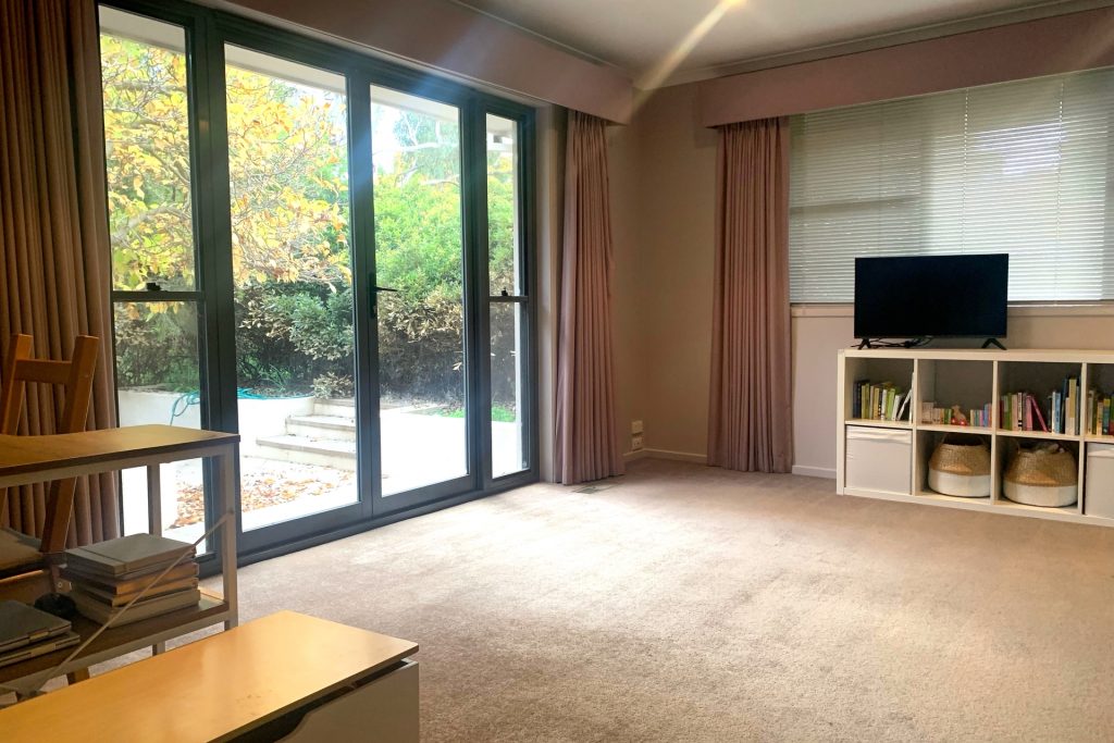 – Light filled living room with French doors opening to side courtyard.