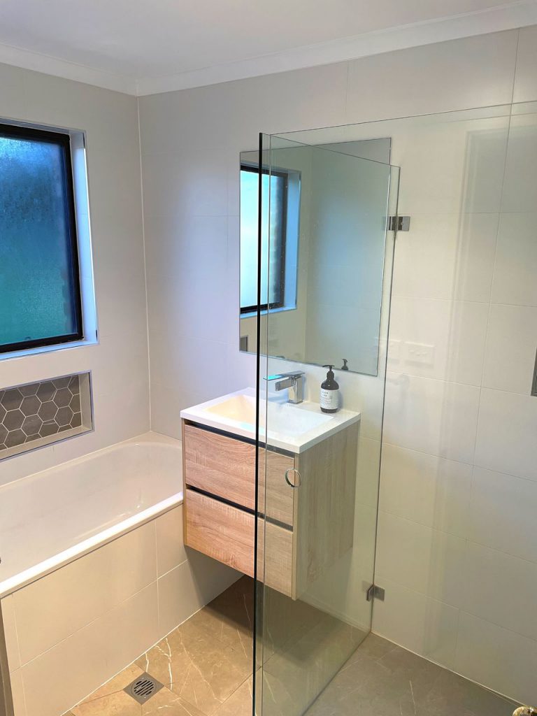 New bathroom & separate toilet with floor to ceiling tiles and bathtub