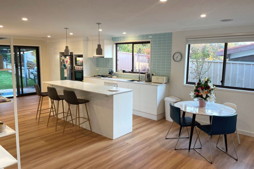 Open plan new designer kitchen with gas cooktop, large island bench and quality appliances