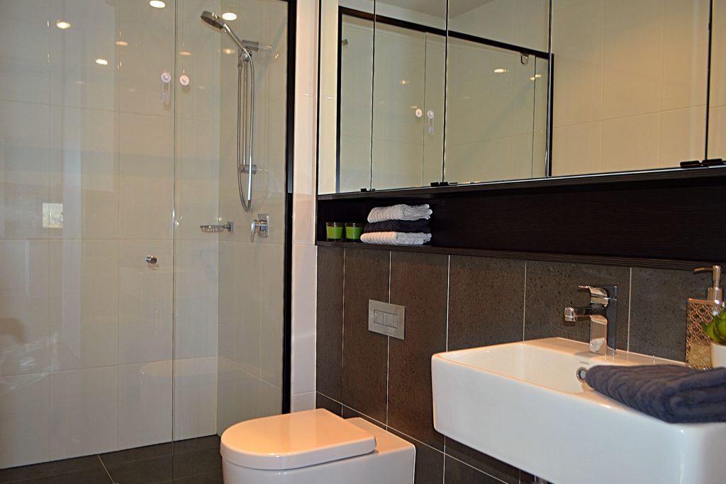 -Modern bathroom with floor to ceiling tiles, oversized shower recess and large vanity/ shaving cabinet storage.