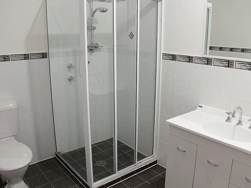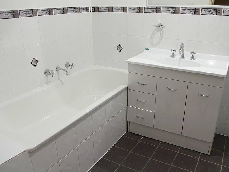 Crisp main bathroom includes bath tub and separate large shower recess, modern vanity and convenient separate toilet.