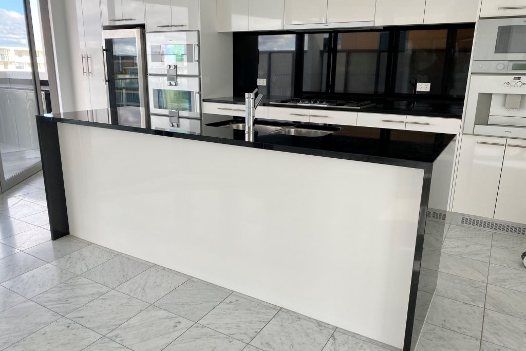 Modern kitchen with an abundance of bench-space, dishwasher, wine fridge, built-in-fridge and gas-cooktop