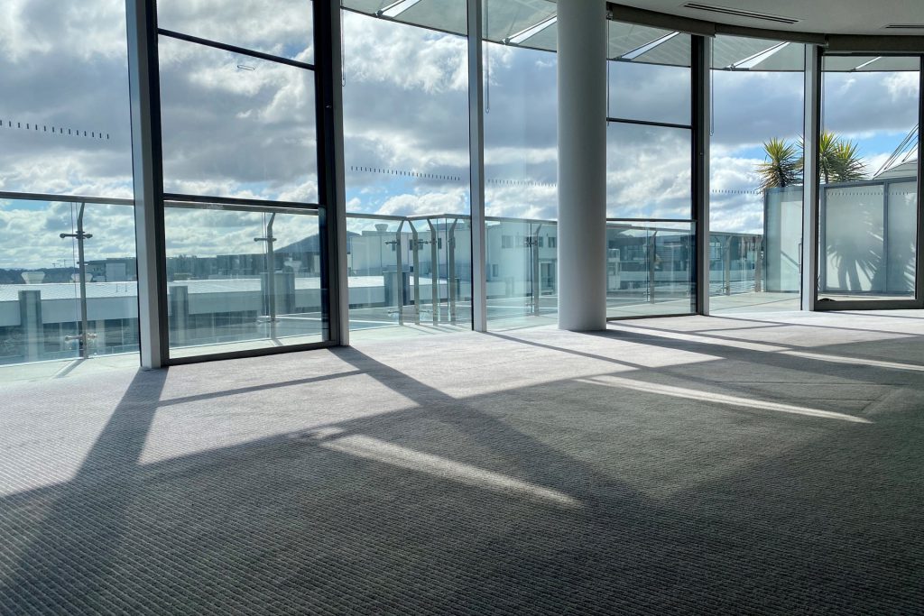 Spacious living area bathed in sunlight with showcase windows and panoramic views