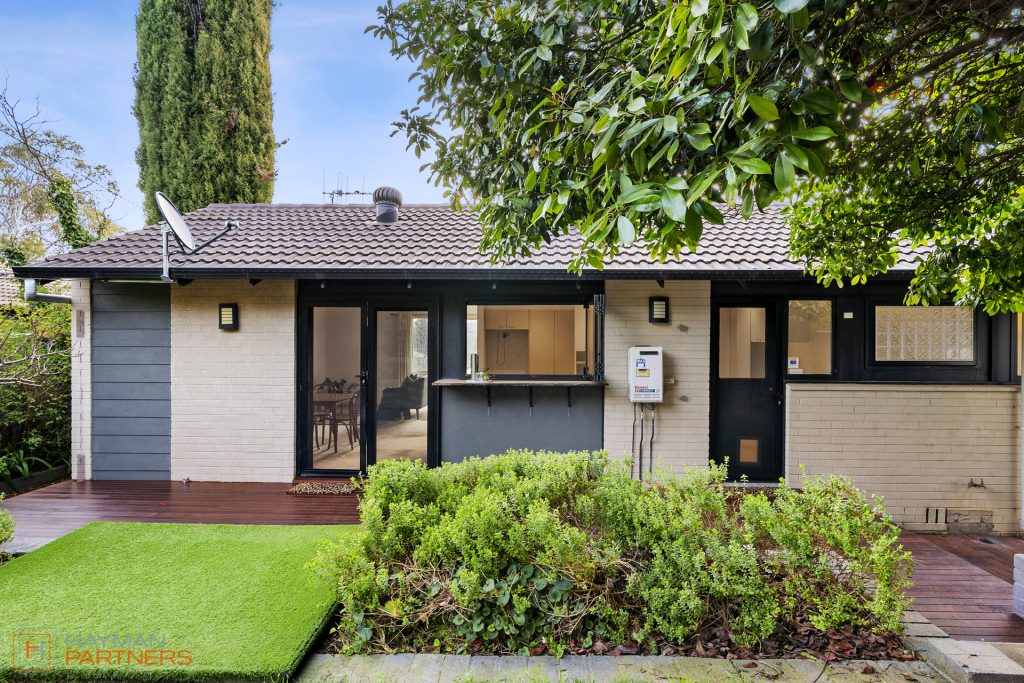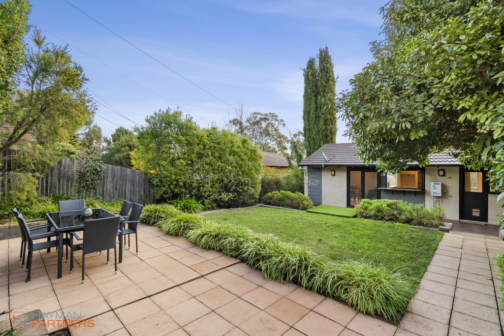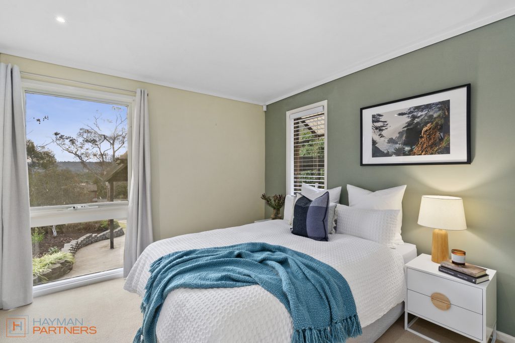 Well set back from the street, the living area of the home features an open plan lounge room and dining space. The area is complimented by a large window to the front with elevated views, and double-glazed French doors to the landscaped garden at the rear, allowing for plenty of natural light, leafy vistas and a seamless flow to the outdoor entertaining area.