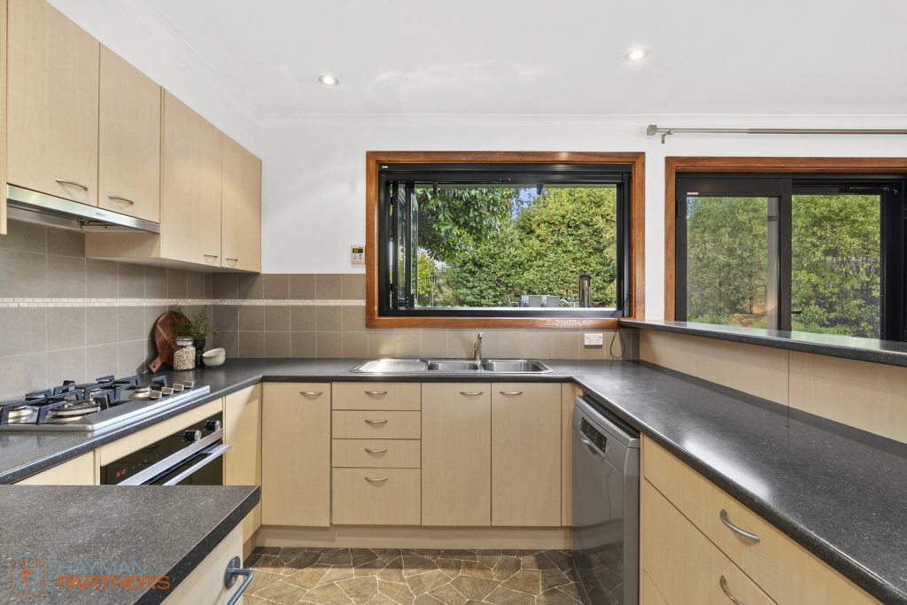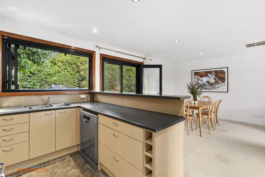 The updated kitchen features plenty of storage and a generous amount of bench space. Appliances include a gas cook top, electric oven, dishwasher and double stainless-steel sink. The large, double-glazed bifold window above the sink provides a leafy outlook with easy vision of the backyard, and opens wide to access the outdoor servery/bar. For added comfort, there is ducted gas heating and evaporative cooling throughout the home.