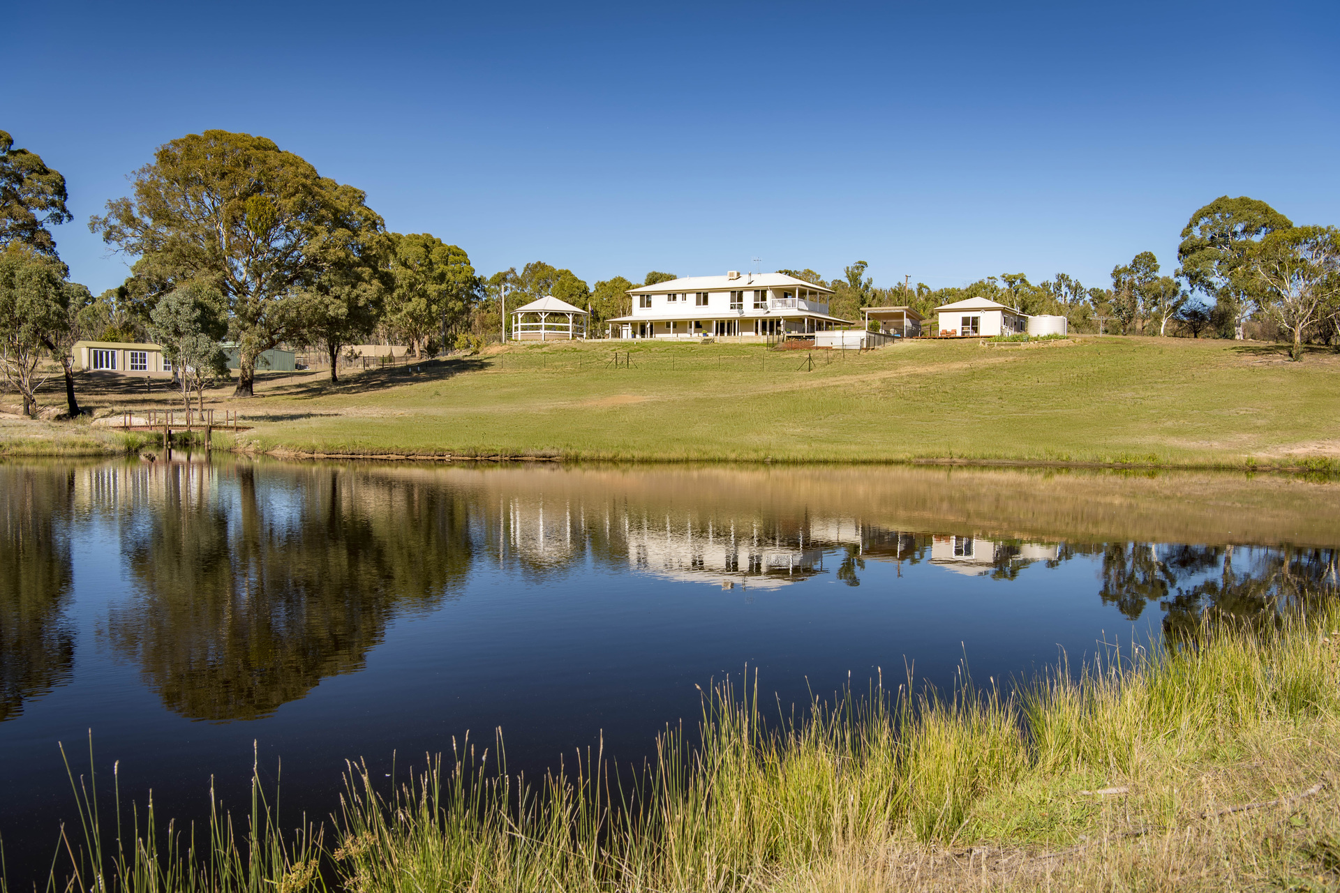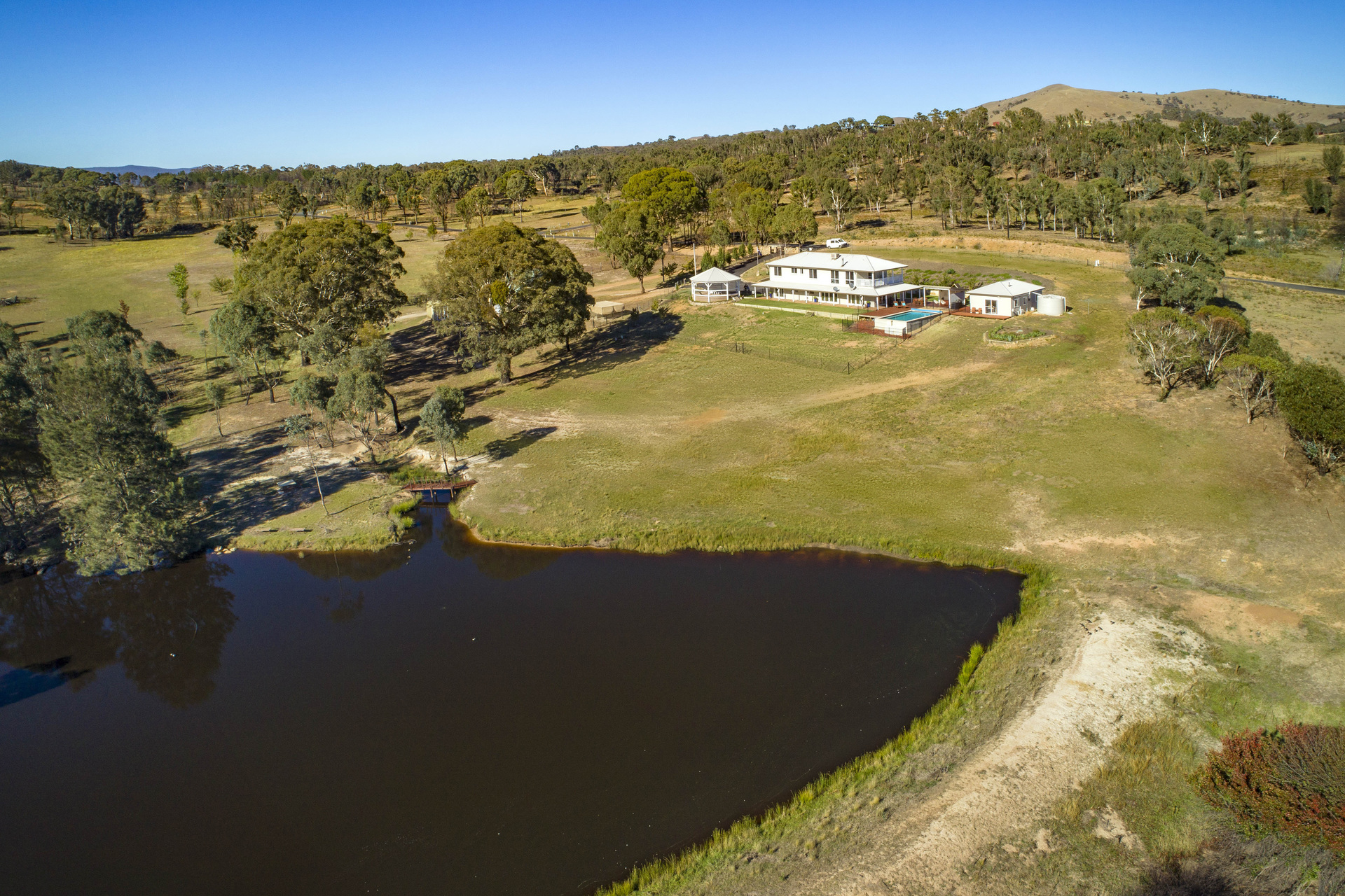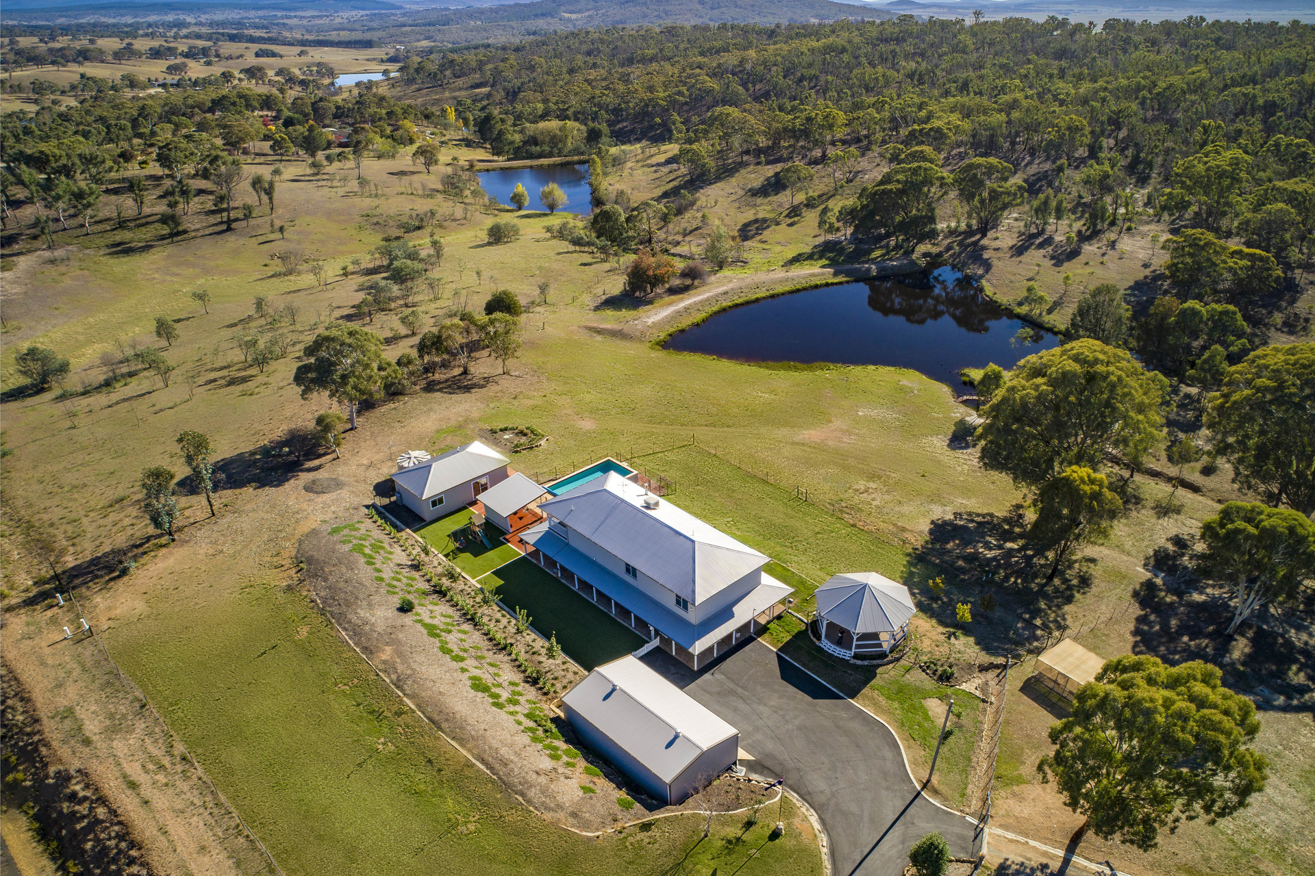 Location and lifestyle reign supreme in real estate and when you find an amazing lifestyle retreat like “Innisfree” within 15 minutes to Canberra then you have a rare opportunity indeed. Take advantage of the benefits of country living, privacy and space to move on this fully fenced 20-acre parcel of land. With sealed roads all the way to the garage doors, making an easy drive from Canberra / Queanbeyan. Ideal for entertaining, ‘Innisfree’ boasts extensive open plan living areas that connect seamlessly to the modern kitchen which overlooks the stunning in ground pool and picnic area by the large dam. The home has ample accommodation to suit most families – The main house has five bedrooms in total, master with ensuite and a glamorous walk-in wardrobe with custom joinery on the ground floor. Bedroom five is also on the ground floor, ideal for a nursery or young children. Located upstairs are the remaining three bedrooms all with built-in wardrobes. There is an oversized rumpus / home gym and separate open plan study with access to its own terrace with views across the property. An additional modern fully self-contained and approved two-bedroom dwelling with open plan living, bathroom with European laundry and its own deck to again enjoy the views, is an ideal escape for teenage children, in-laws or even an Airbnb. Yet another out-building provides a separate studio / workshop / home office, offering work from home options, or an impressive ‘man-cave’/getaway space.